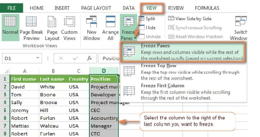 - Bước 1: Chọn cột bên phải các cột mà bạn muốn cố định. Ví dụ: Muốn cố định 3 cột đầu tiên, bạn cần chọn cột số 4 (cột D).