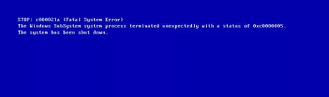 Dưới đây là thông báo lỗi 0xC000021A trên hệ thống Windows XP, Windows Vista hoặc Windows 7.