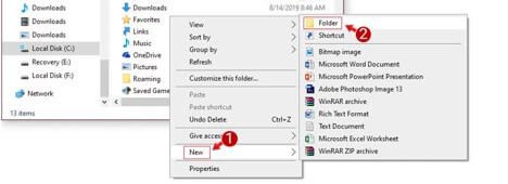 Bước 2: Kích chuột phải vào khoảng trống bất kỳ, sau đó chọn New > Folder.