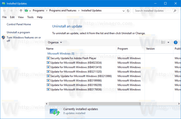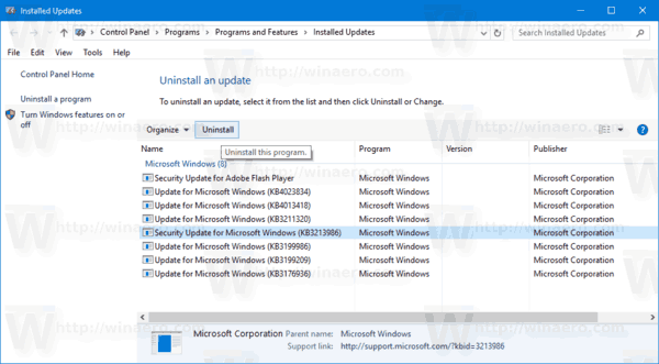 Trong danh sách, chọn bản cập nhật mong muốn và nhấp vào nút Uninstall trên thanh công cụ.