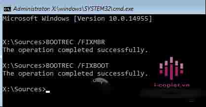 Gõ bootrec.exe /fixmbr và nhấn Enter, sau đó gõ bootrec.exe /fixboot và nhấn Enter. Bạn sẽ thấy The operation completed successfully bên dưới mỗi lệnh. Nếu không thấy thông báo hoàn thành thao tác và nhận được lỗi, nhập bootrec.exe /rebuildbcd và nhấn Enter. Lệnh “rebuildbcd” sẽ xây dựng lại hệ thống Boot Data Data (BCD).