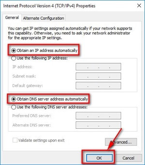 Bước 5: Tiếp theo kiểm tra xem các tùy chọn Obtain an IP address automatically và Obtain DNS server address automatically đã được chọn chưa, nếu chưa hãy tích vào các tùy chọn này và nhấn OK.