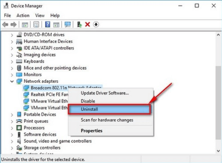Bước 4: Nhấn chuột phải vào tên card mạng của bạn đang sử dụng và nhấn Uninstall.