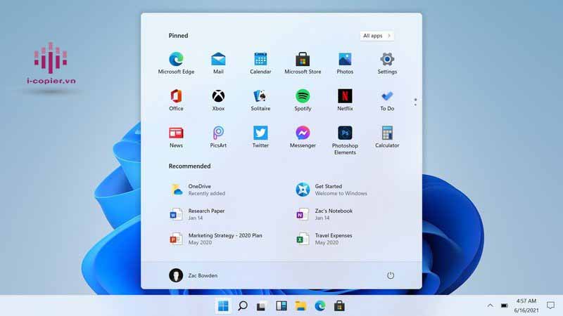Với Start Menu, khi bạn nhấp vào thì hệ thống sẽ xổ ra các ứng dụng có trên máy (như Launch Pad của macOS) và các ứng dụng hay sử dụng nhất ở bên dưới. Cùng với đó, thanh công cụ tìm kiếm trên Window 11 đã được thu gọn lại thành icon “kính lúp” và loại bỏ chức năng trợ lý ảo Cortana.