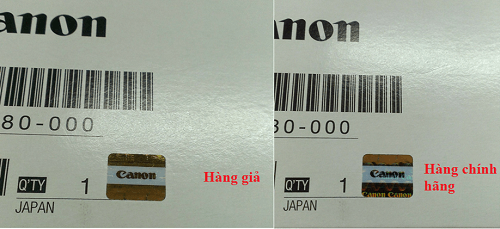 Seal niêm phong của hộp mực Canon không chính hãng (bên phải) không được in logo Canon