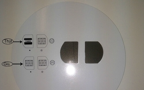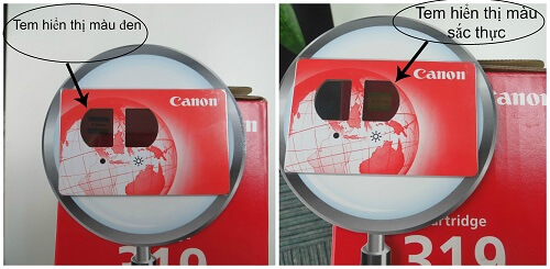 Tem chống giả của mực in Canon chính hãng (bên phải) sẽ đổi màu theo góc nhìn