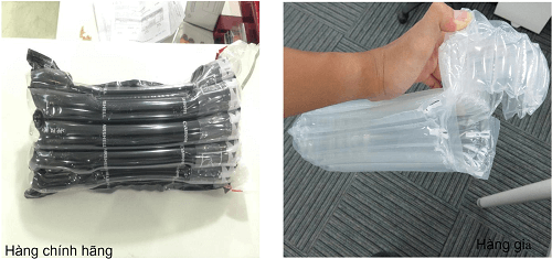 Túi khí bảo vệ của hộp mực Canon chính hãng (bên trái) sẽ bị xì hết hơi sau khi lấy sản phẩm ra ngoài