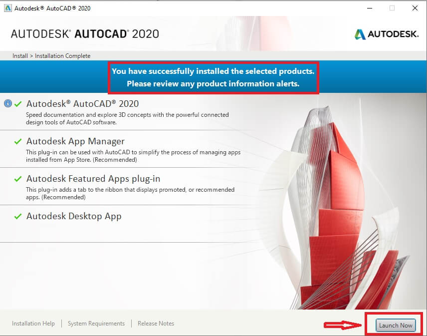 Bước 7: sau khi xuất hiện thông báo như hình dưới chọn Lauch Now để hoàn thành việc cài đặt autocad