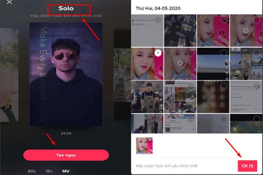 • Bước 4: Bấm tiếp vào Tạo ngay → Chọn lựa hình ảnh trong Album để đưa lên Tiktok → Bấm OK khi bạn chọn xong.