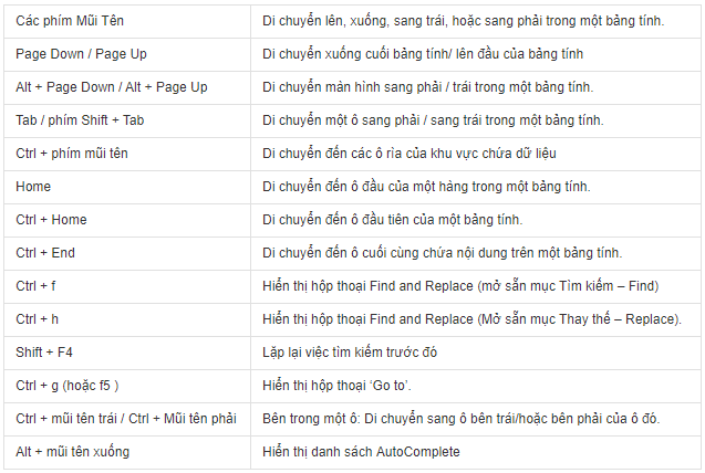 2. Phím tắt Excel giúp điều hướng trong bảng tính Excel;