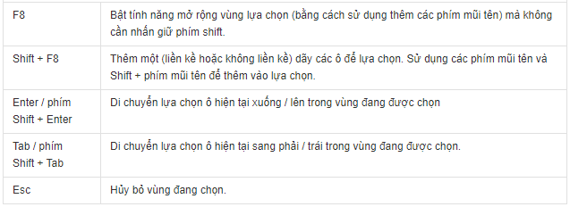 1. Các phím tắt trong Excel làm việc với vùng dữ liệu được chọn